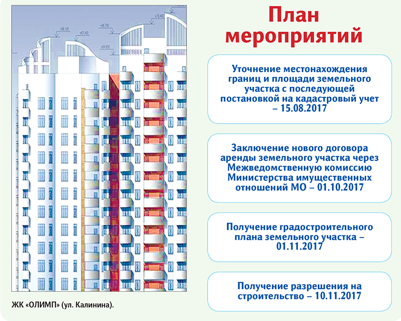 И вот наконец-то в текущем году удалось зарегистрировать на этот объект право собственности за компанией ЗАО «Техинвестстрой». Проведено собрание кредиторов ЖК «Олимп», которое приняло решение о замещении активов. Это позволит нам выйти на завершающую стадию получения разрешения на строительство.