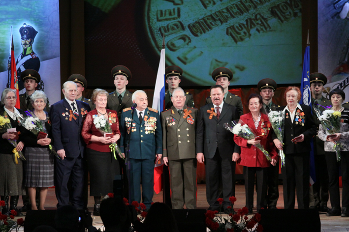 Глава города Александр Ходырев торжественно наградил королёвских ветеранов памятными медалями «70 лет Победы».В ЦДК им. М.И. Калинина собрались участники Великой Отечественной войны и трудового фронта, представители городской Администрации, общественность Королёва, учащаяся молодёжь.Звучит Гимн России. В зал торжественно вносят флаги России, Московской области и города Королёва.У микрофона — Глава города Александр Николаевич Ходырев:— Дорогие солдаты, сержанты, старшины, офицеры, генералы, ветераны Великой Отечественной войны, труженики тыла! Поздравляю вас с праздником — Днём защитника Отечества! Долг любого мужчины — любить свою Родину, свою семью, свой народ и защищать их. Хочу выразить благодарность тем, кто и в мирное, и в военное время, кто в горячих точках, таких, как Афганистан и Чечня, а сегодня это ещё и Украина, принимал участие в боевых действиях. Мы сегодня склоняем головы и говорим слова благодарности тем, кто отстоял Победу в Великой Отечественной войне. Мы говорим: нет — нацизму, нет — фашизму, нет — национализму! Мы — это люди, которые хотят жить мирно, благоустраивать наши города, поднимать сельское хозяйство, возрождать предпринимательство, осваивать космос. Вот наша главная задача! Наш Президент, Правительство России, наш Губернатор и мы на местах стараемся помогать участникам Великой Отечественной войны, их вдовам и родственникам, а также тем ветеранам, кто совсем одинок. Стараемся не оставить их в беде и помогаем решить бытовые задачи, с которыми ветеран сталкивается.Сегодня мы начинаем вручать медали в честь 70-летия Победы в Великой Отечественной войне. На территории нашего города проживает около 400 ветеранов. Хотелось бы сказать слова благодарности тем, кто и по сей день продолжает патриотическое воспитание нашей молодёжи в школах и общественных организациях. Выражаю глубокое уважение тем людям, которые неравнодушны к мероприятиям, проводящимся совместно с ветеранами, будь то памятная дата контрнаступления под Москвой, или памятная дата вывода войск из Афганистана, или сегодняшнее собрание, посвящённое Дню защитника Отечества.Также хочу сказать слова благодарности нашей молодёжи, которая чтит память и благодарит ветеранов за их подвиги. Молодёжь сегодня вместе с вами, дорогие ветераны, находится в одной шеренге, в одном строю, в одной колонне. Вместе мы — сила! Вместе мы — непобедимы! Поздравляю с Днём защитника Отечества! Низкий поклон вам, дорогие ветераны, военнослужащие и все те, кто носит высокое звание — защитник нашего Отечества!На сцену выходит председатель городского Совета ветеранов генерал-майор Василий Васильевич Курбатов. Александр Ходырев и Василий Курбатов торжественно награждают ветеранов Великой Отечественной войны, ветеранов труда, блокадников, тружеников тыла памятными медалями. Все собравшиеся получили символичные георгиевские ленточки.Официальную часть завершила минута молчания в память о тех, кто не вернулся с войны. Затем состоялся праздничный концерт, подготовленный мастерами искусств нашего города.Ирина КРОТОВА
